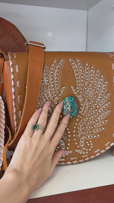 Hand-tooled leather saddle bag featuring a genuine turquoise gemstone and silver-shimmer wings on the flap. Mid-size silhouette in antique tan with feather tassel details. Adjustable strap converts between crossbody and shoulder wear. Zippered top with interior zippered pocket and two open pockets. 100% cotton Jodi Lee lining and protective dust bag included. Measurements: 24cm H × 25cm W, adjustable strap 67–130cm.